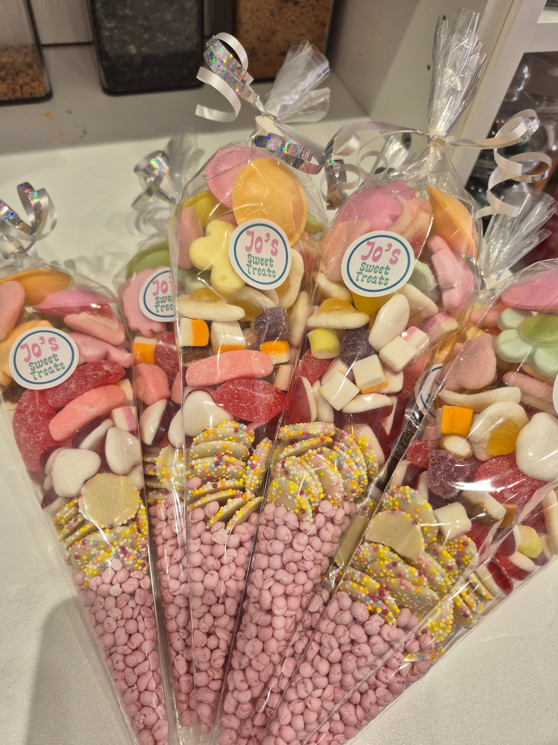A variety of sweets in a party cone, finished with ribbon. Cones can be made to suit any dietary requirements. Please leave a note at checkout with any colour themes or requirements .
